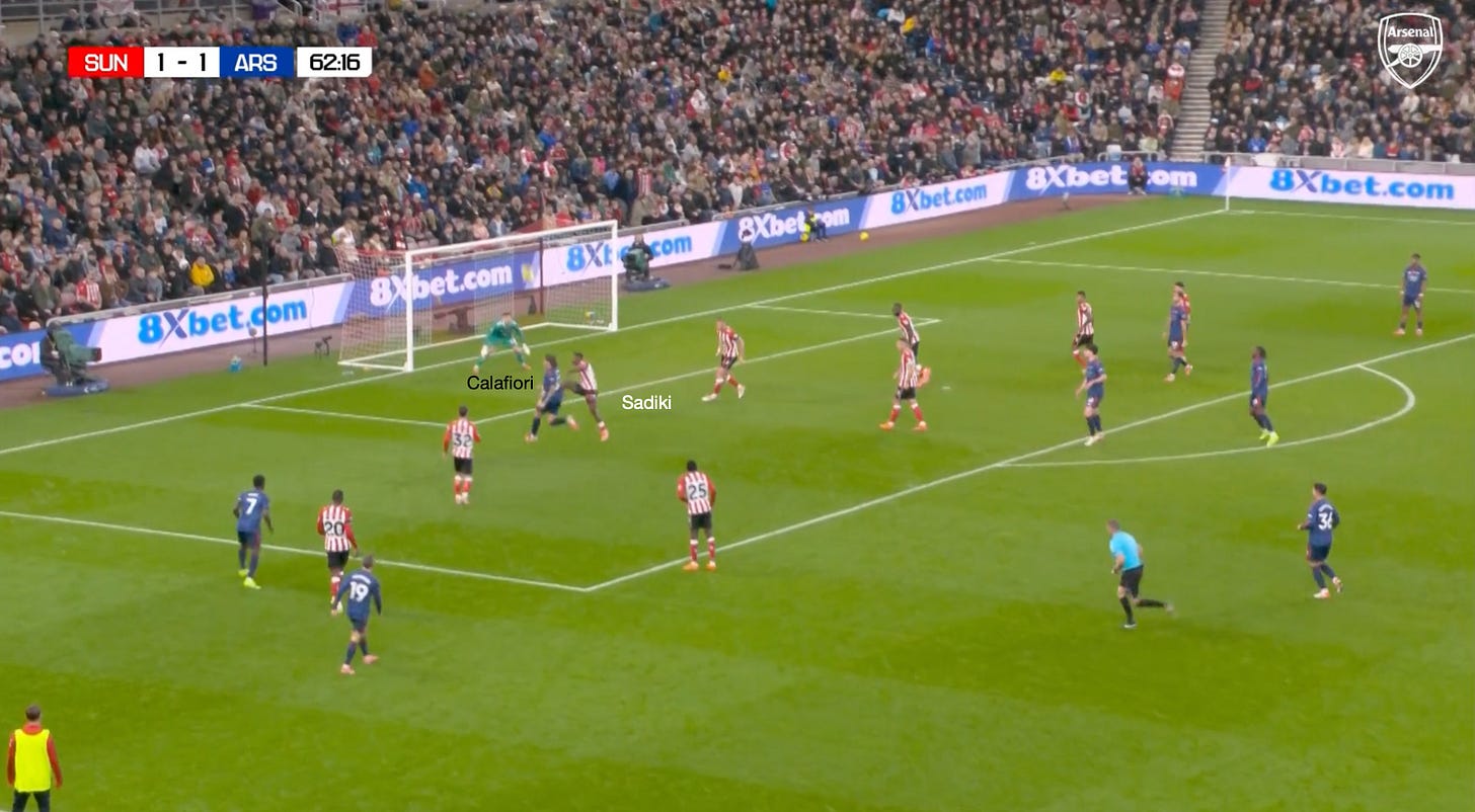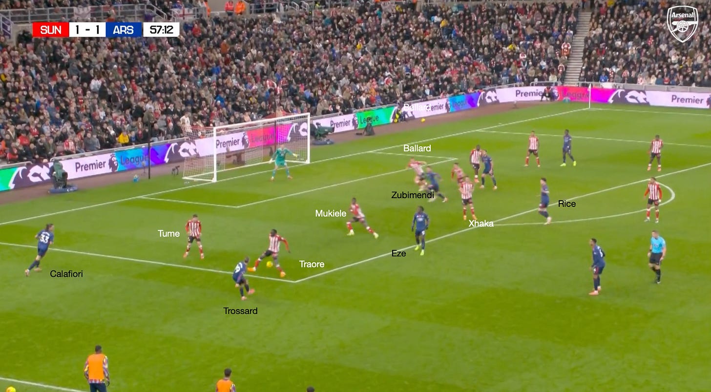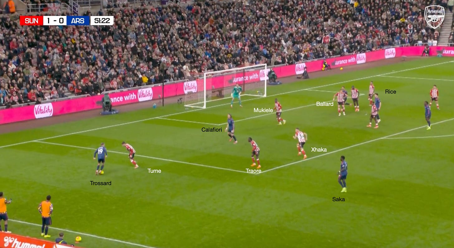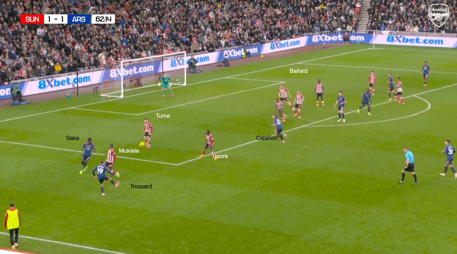 However, going back to the Sunderland game and these dynamic arrivals through the left-hand side, you can see another situation where the principles already described are illustrated. The only difference is that Mukiele and Tume have situationally swapped roles, with Saka drawing Tume wide, which allows Calafiori to attack the space, and he almost latches onto the pass by Trossard.