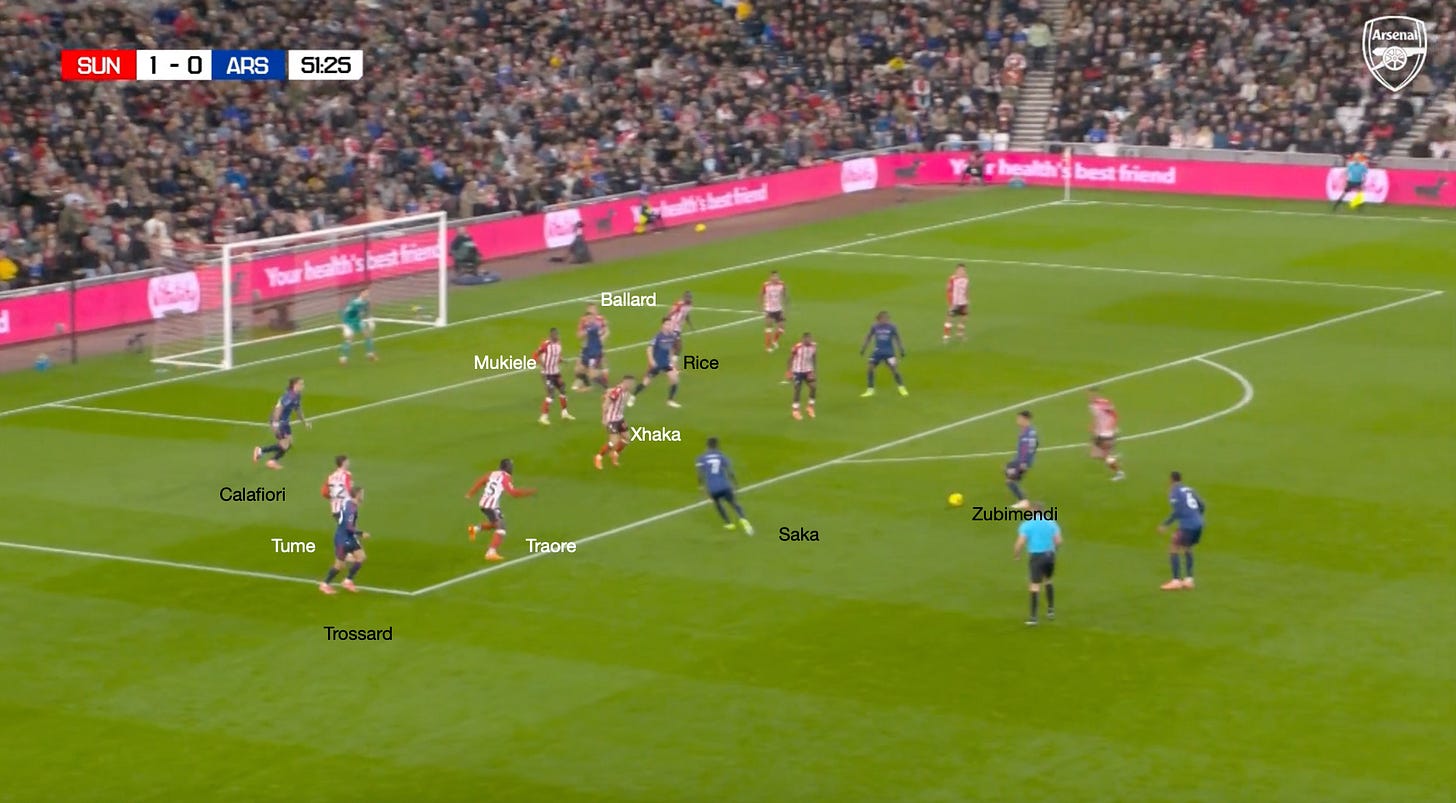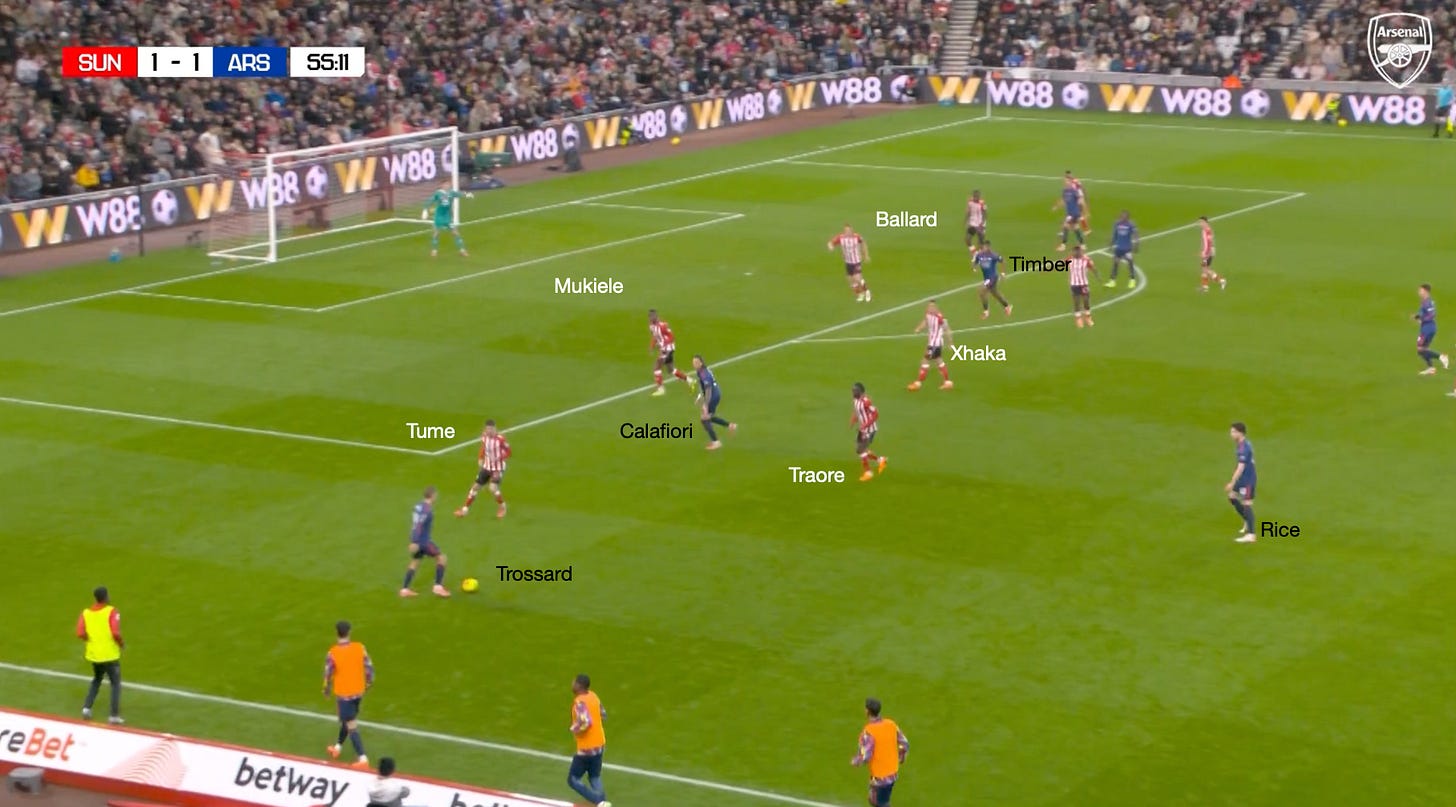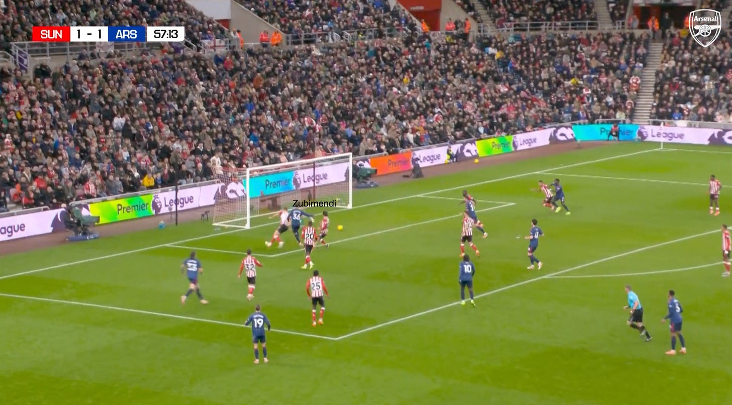 However, going back to the Sunderland game and these dynamic arrivals through the left-hand side, you can see another situation where the principles already described are illustrated. The only difference is that Mukiele and Tume have situationally swapped roles, with Saka drawing Tume wide, which allows Calafiori to attack the space, and he almost latches onto the pass by Trossard.