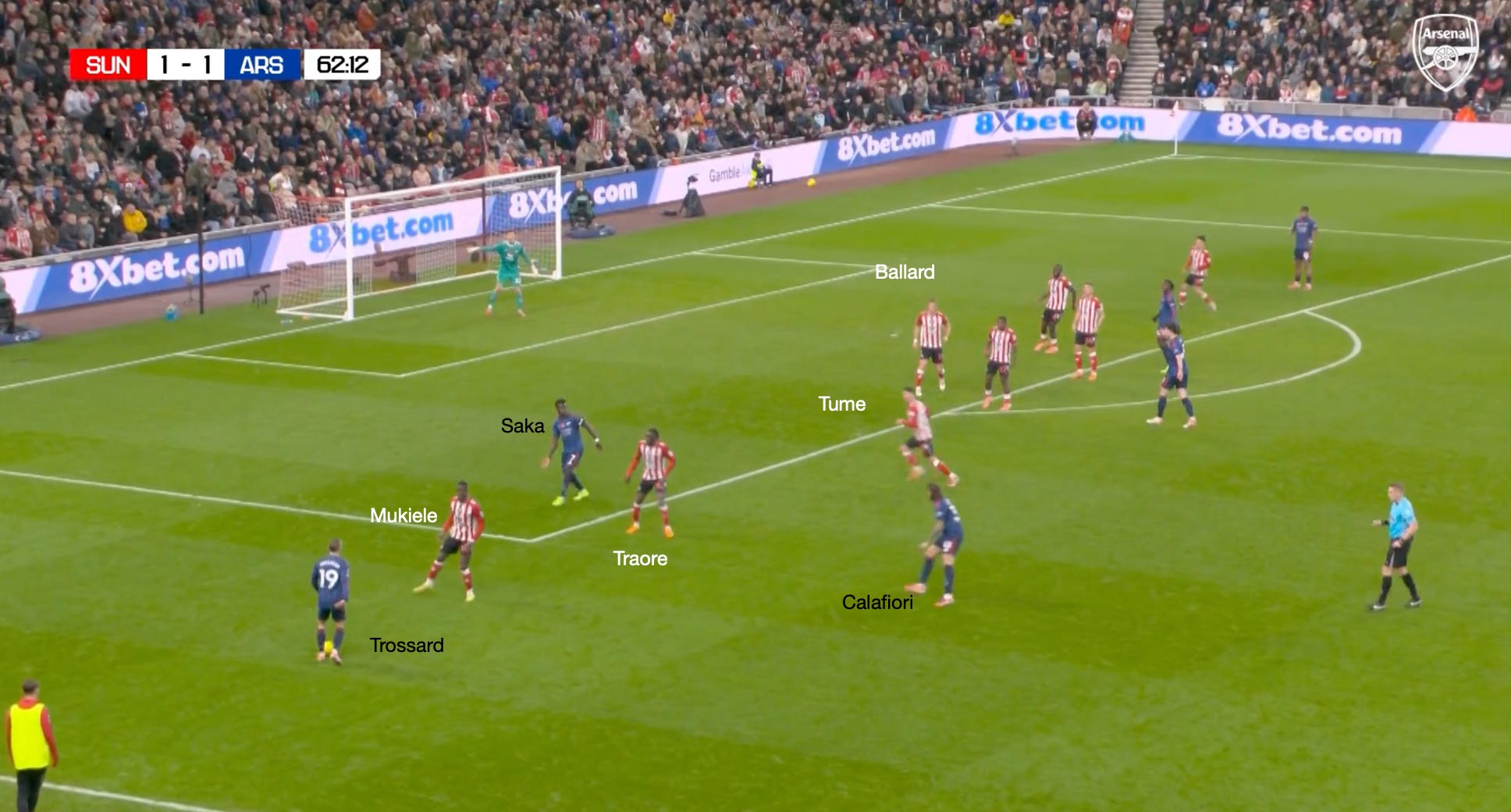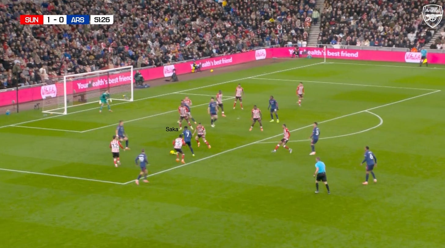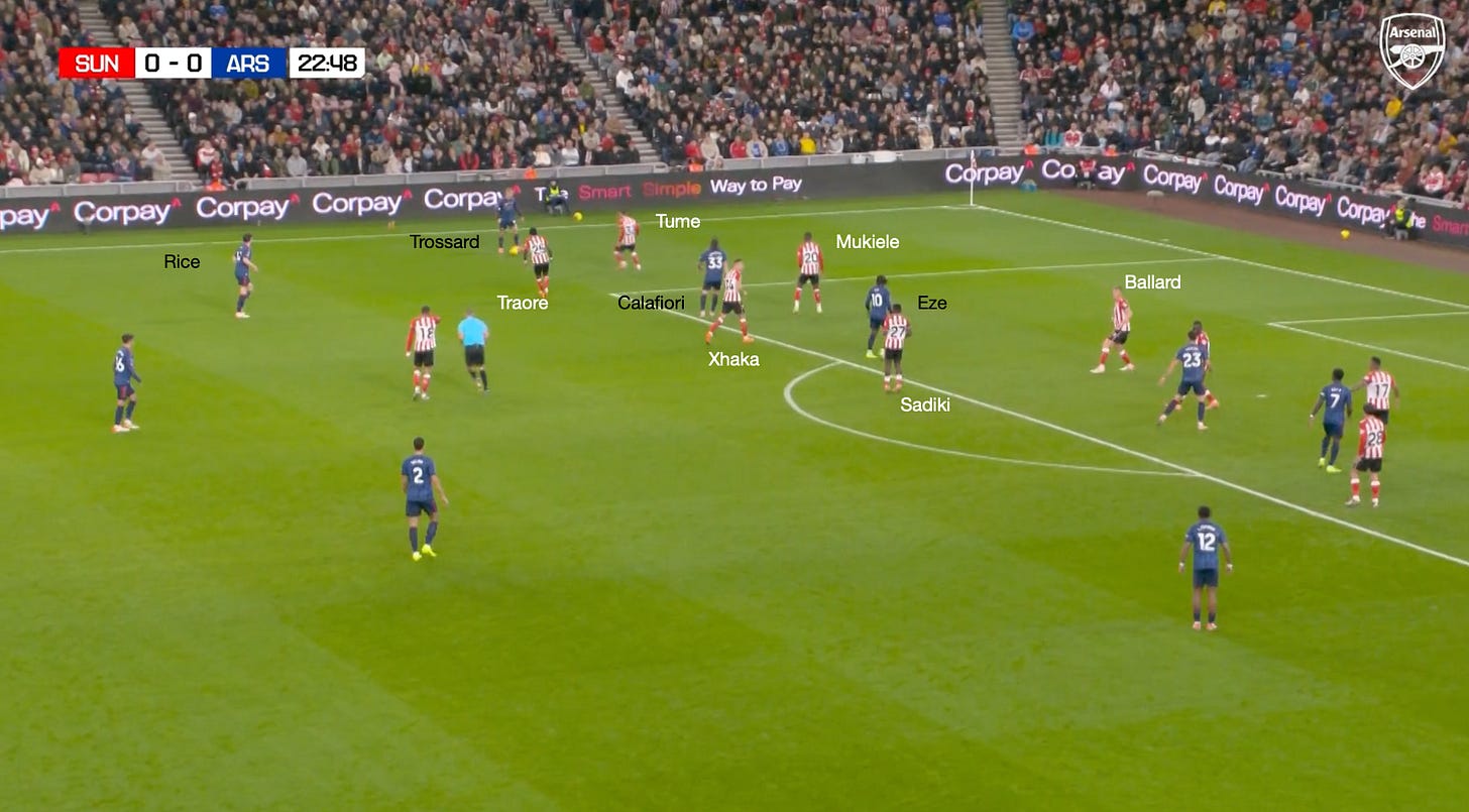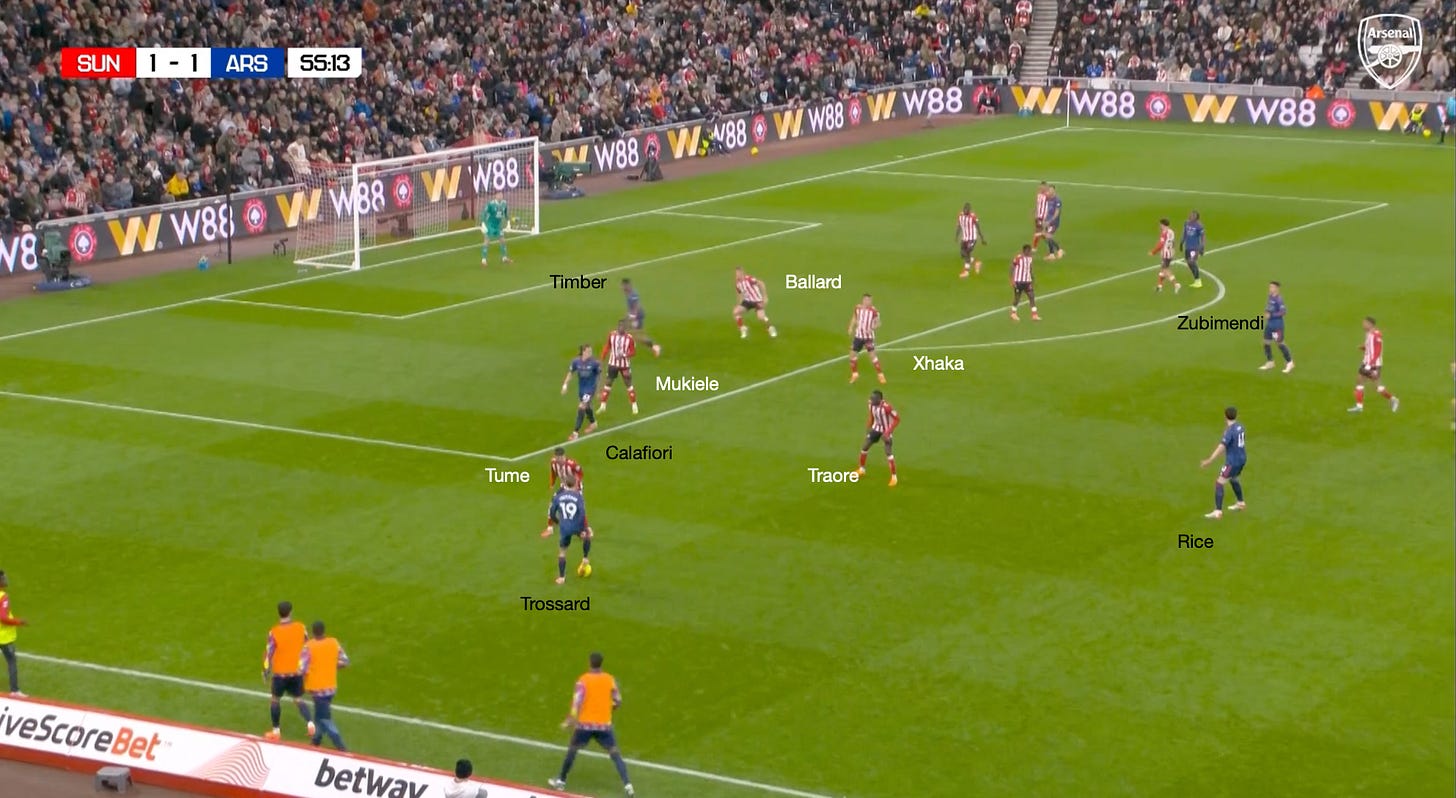 However, going back to the Sunderland game and these dynamic arrivals through the left-hand side, you can see another situation where the principles already described are illustrated. The only difference is that Mukiele and Tume have situationally swapped roles, with Saka drawing Tume wide, which allows Calafiori to attack the space, and he almost latches onto the pass by Trossard.