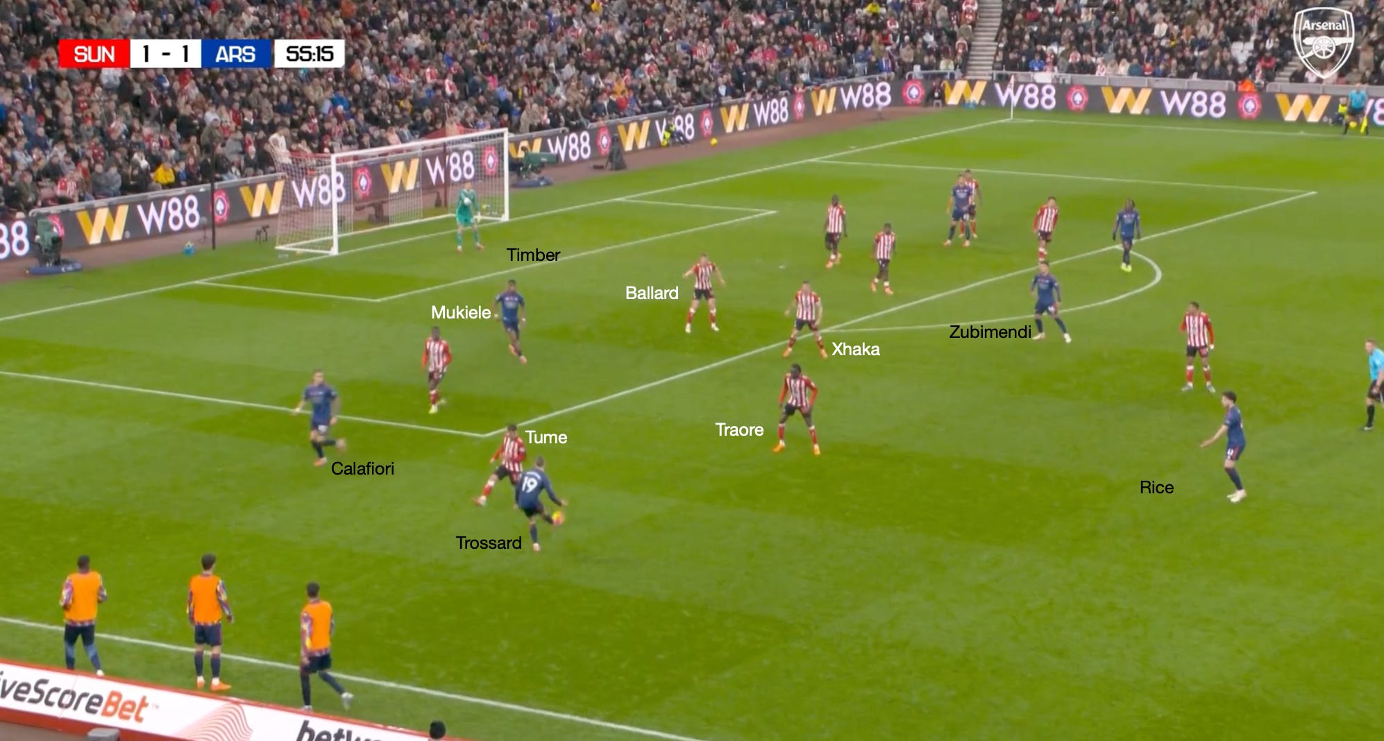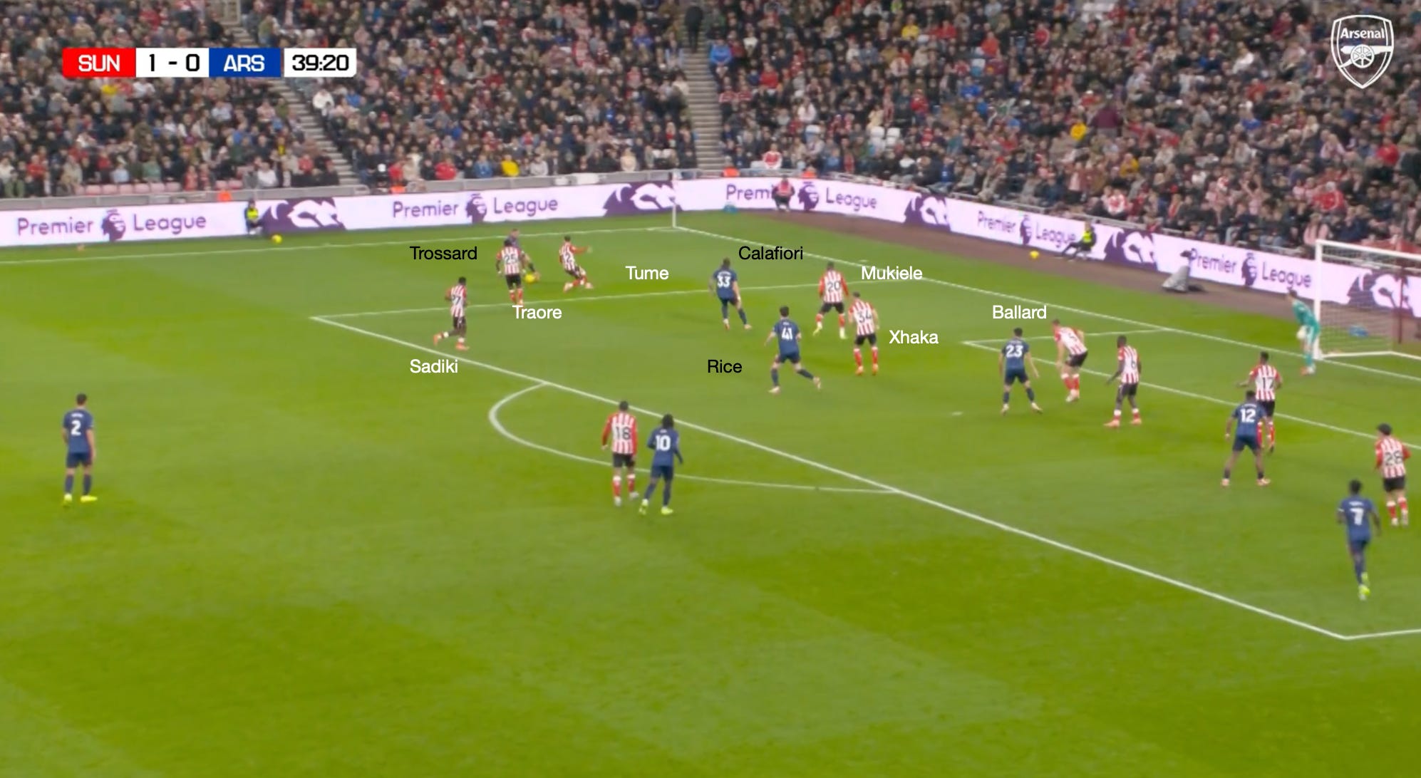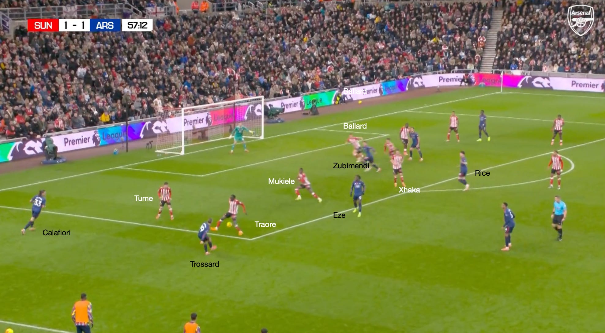 Trossard’s gravity attracts Hume and Traoré, which opens space for Rice in the half space to whip a cross in towards the back post, which Sunderland comfortably defends.