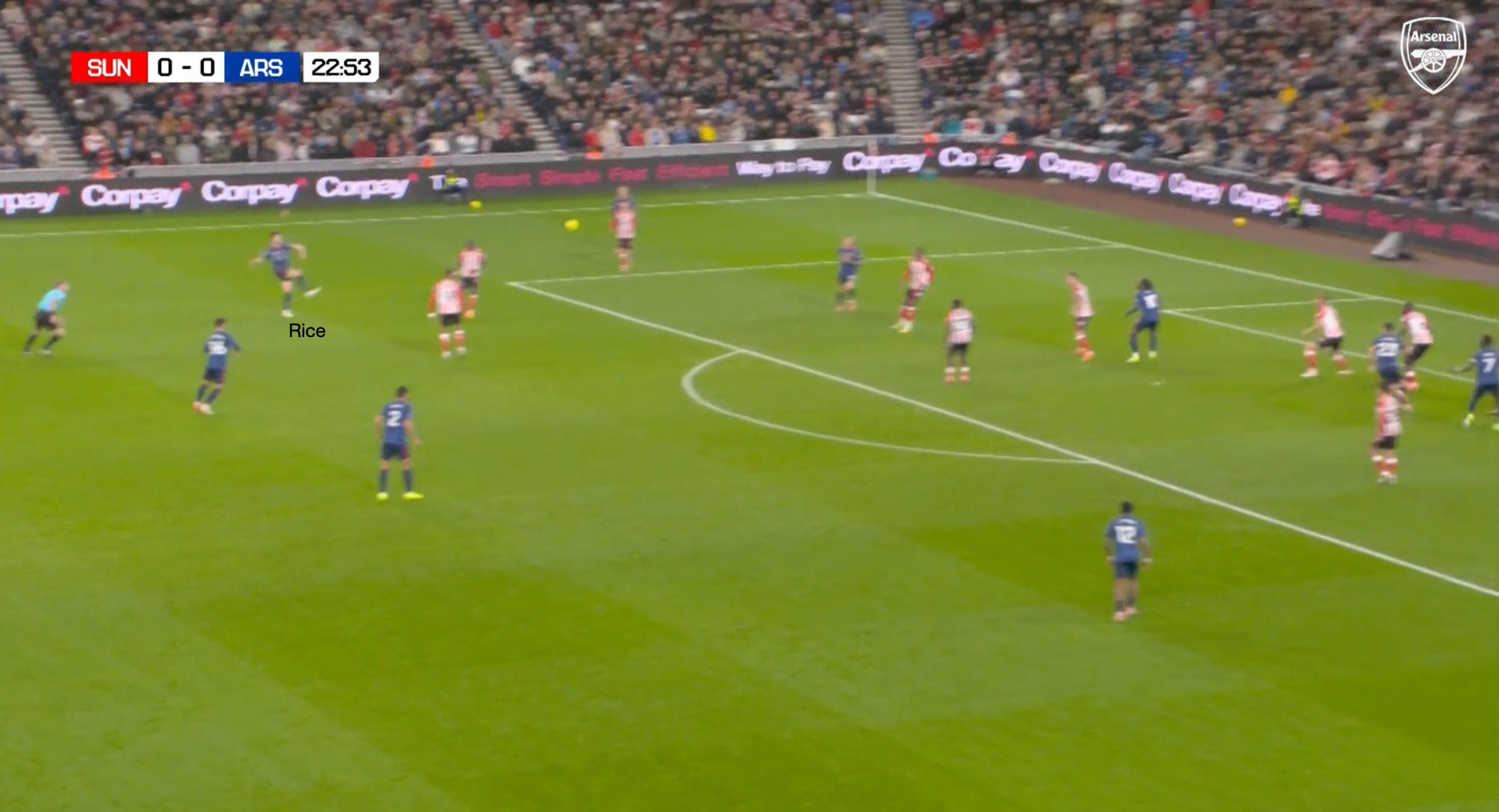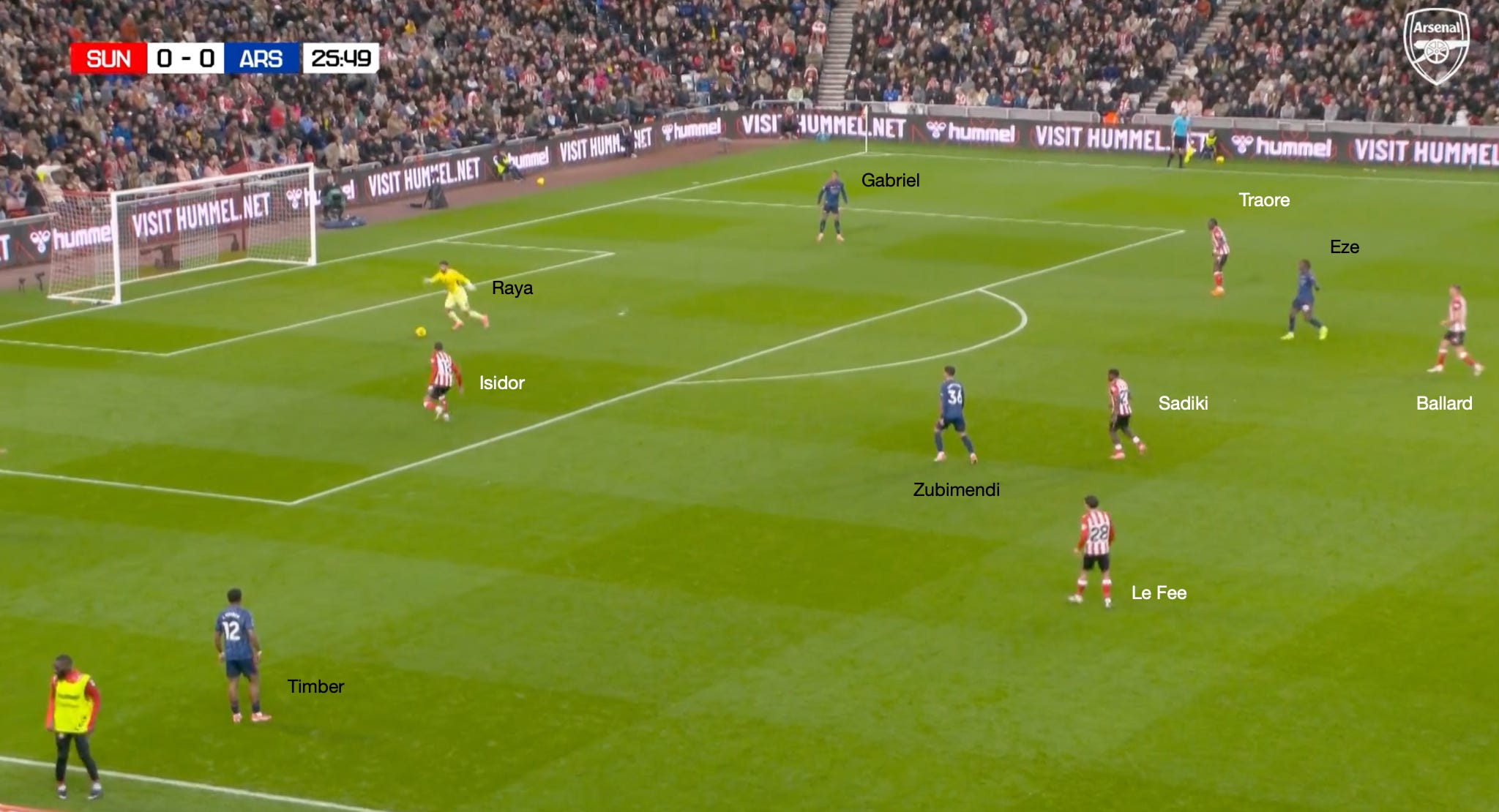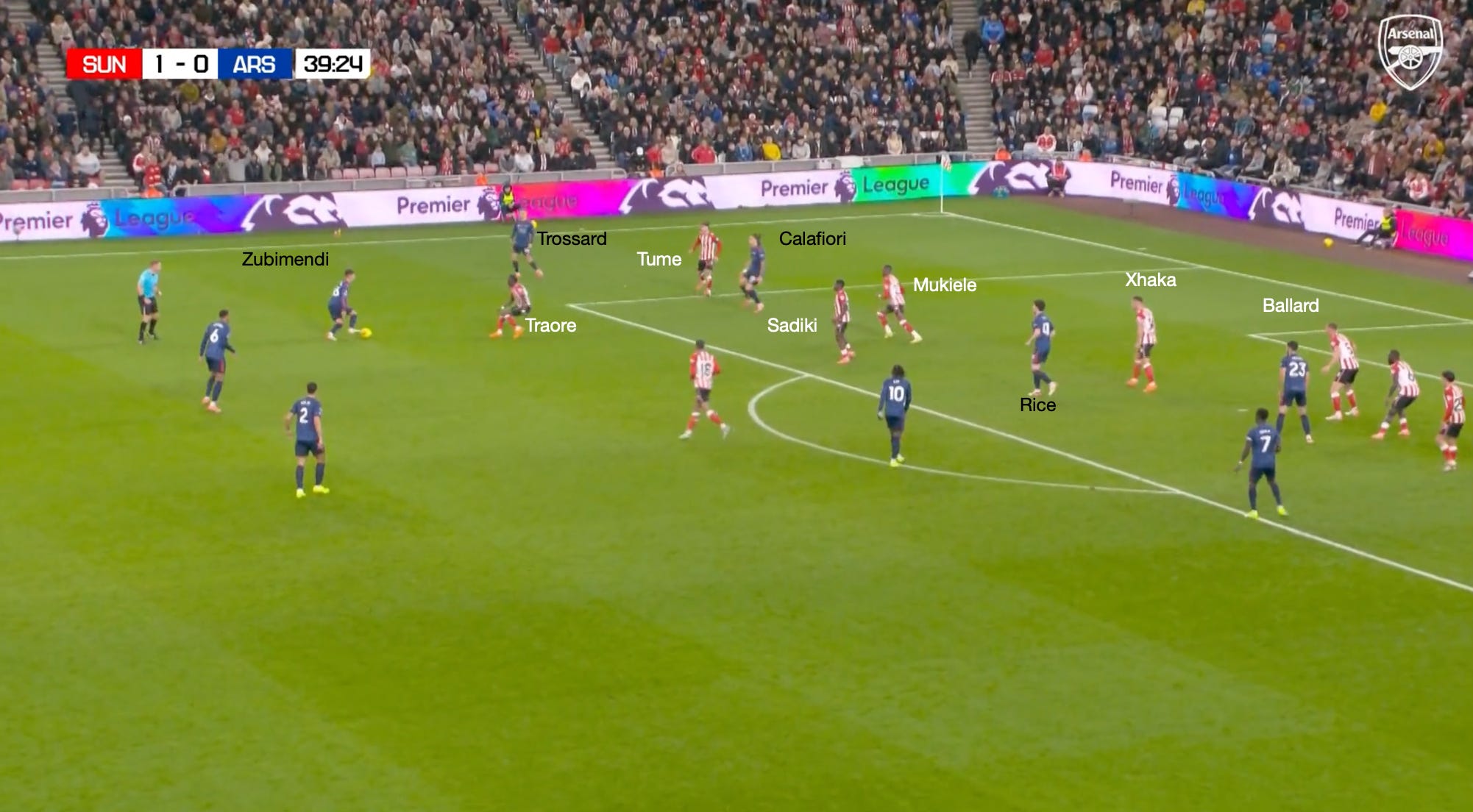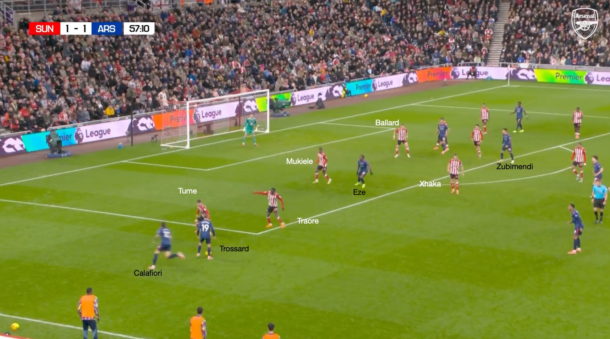 Trossard’s gravity attracts Hume and Traoré, which opens space for Rice in the half space to whip a cross in towards the back post, which Sunderland comfortably defends.