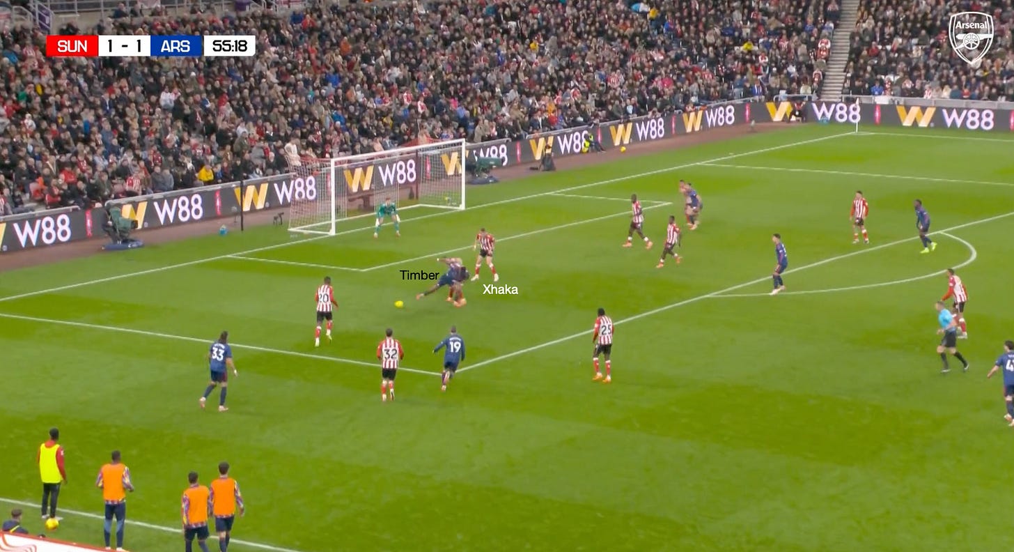 Remember, as mentioned in my previous articles, pinning the central defenders on the outside is imperative. What’s key is that the space between Mukilele and his partner, Ballard, is left free, ready for someone to arrive dynamically, as opposed to someone already stationed there to pin Ballard. The trigger to find the onrushing runner, in this scenario, Jurrien Timber, is when the wide central defender (Mukiele) is either dragged away from the compact back five or jumps forward. Whilst Trossard doesn’t initially deliver the pass to Timber, he does find the right back after Calafiori pulls Mukiele wide. Granit Xhaka, however, manages to deal with the situation.