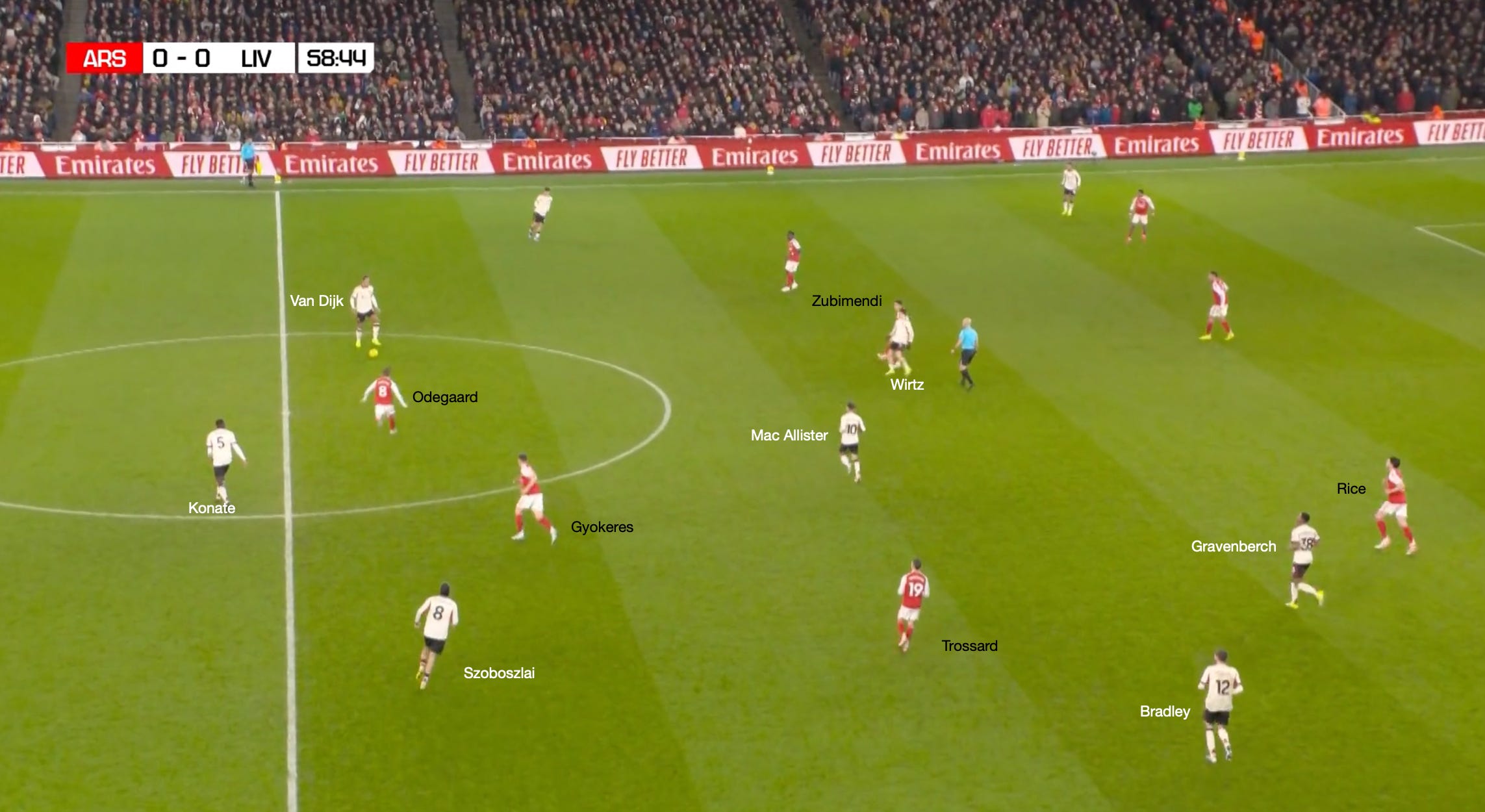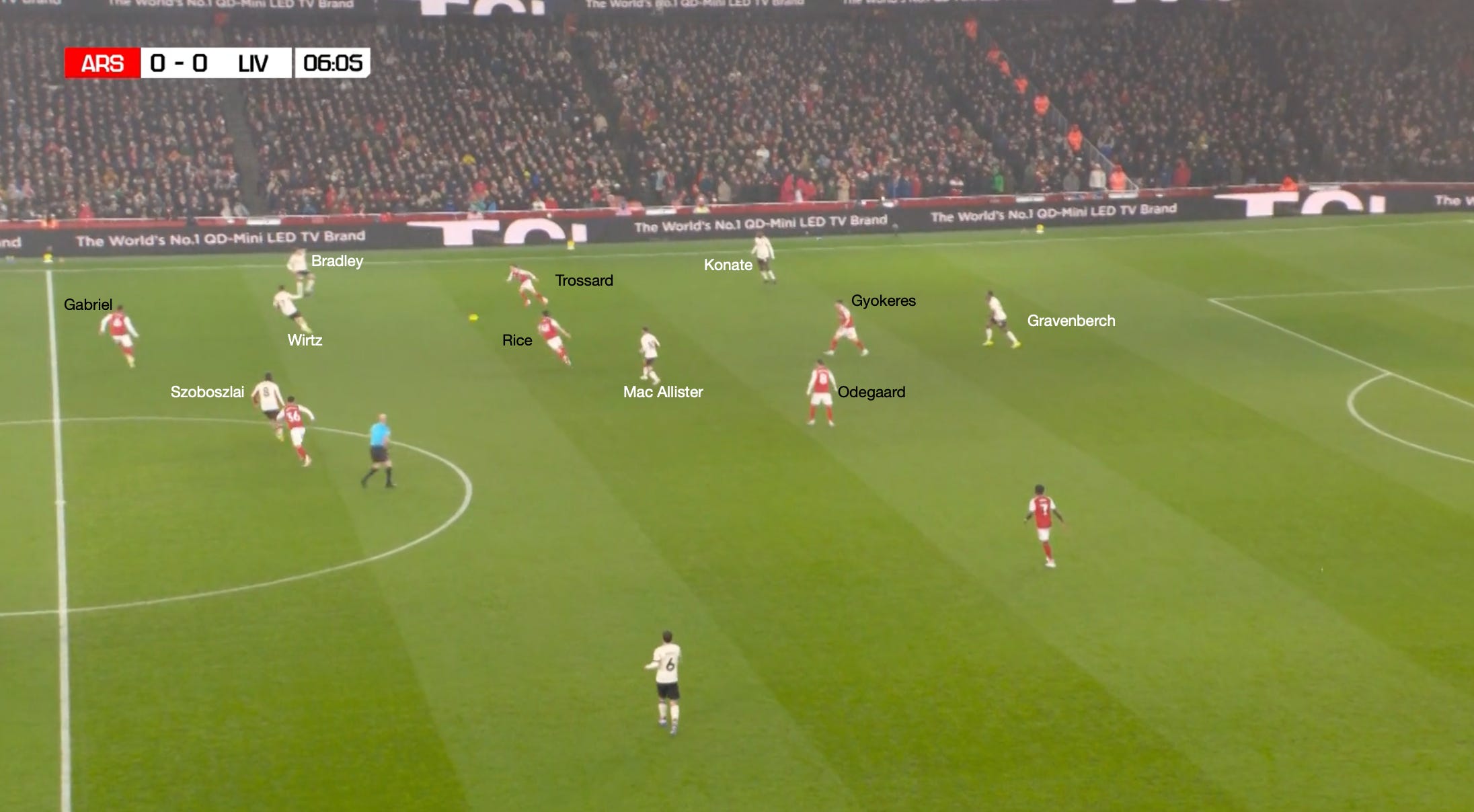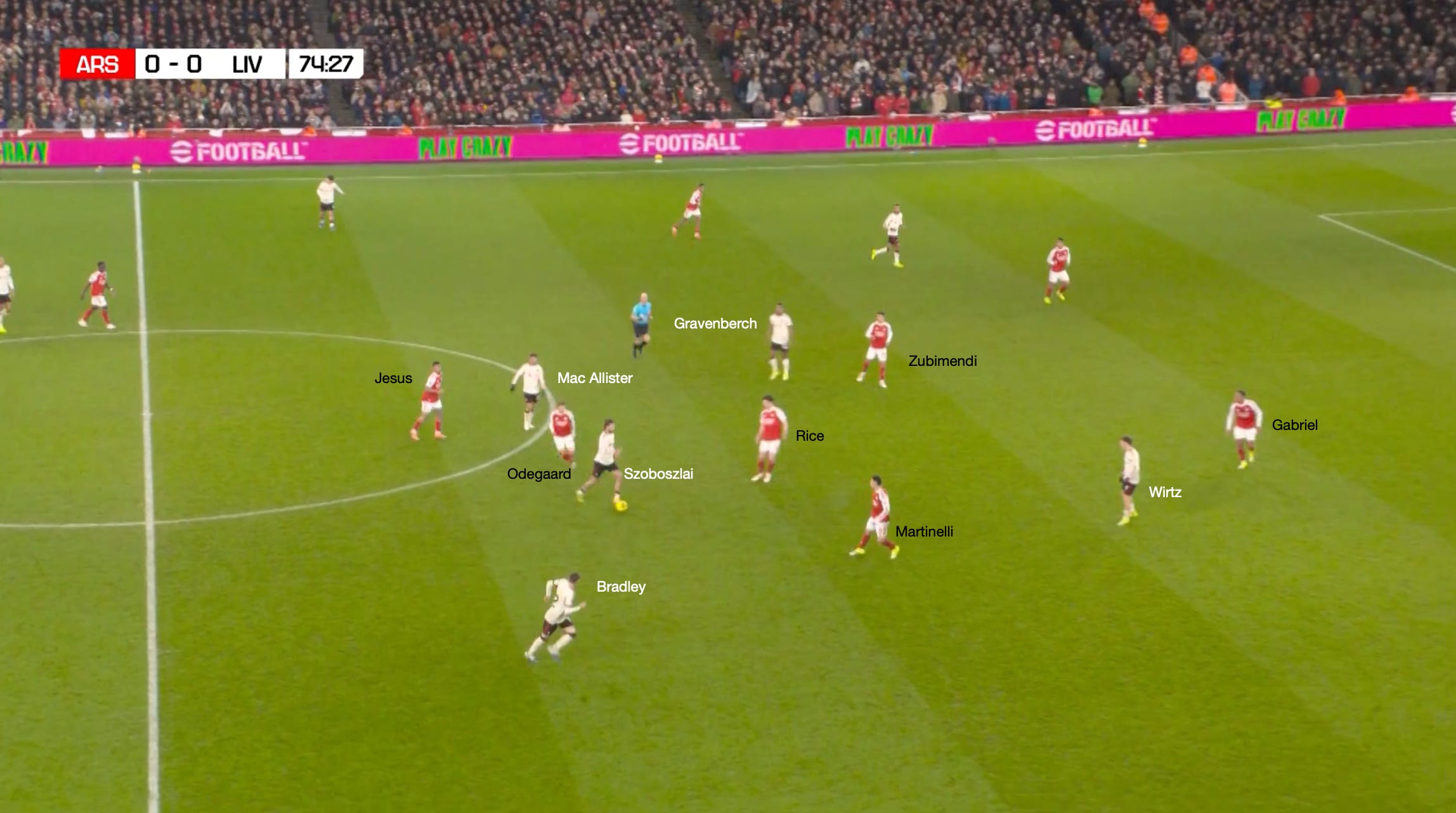 Here’s a final example shown below where the same pattern emerges. Neither Gabriel Jesus nor Ødegaard deny the entry pass into Mac Allister, and Rice can’t jump because of Szoboszlai. However, the general hesitancy displayed by our players, as Rice shows here, allowed Liverpool players, like Szoboszlai here, to get on the ball anyway. Notice Wirtz again in the left half space, with big Gabriel unsure to follow because of the run Frimpong could make in behind.
