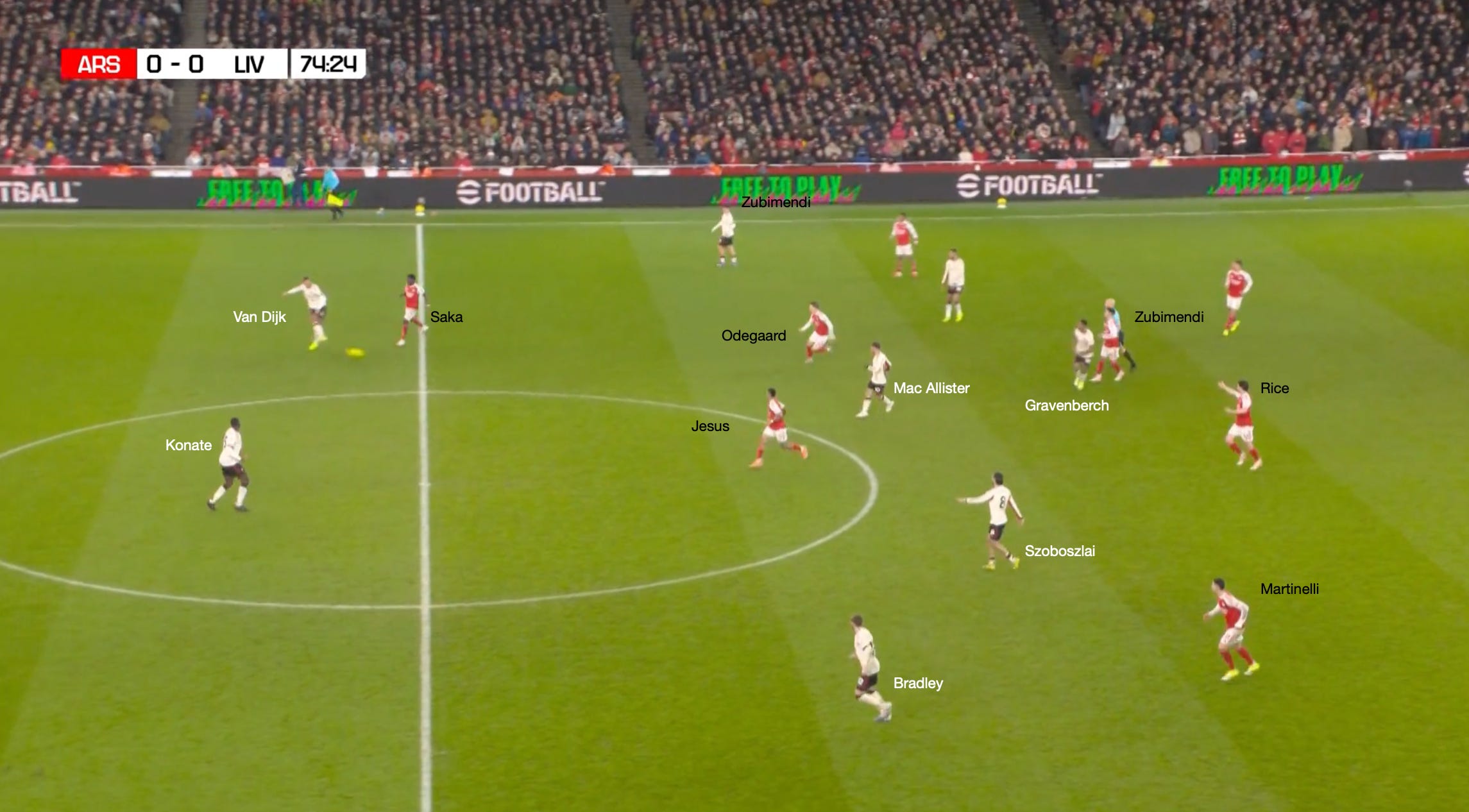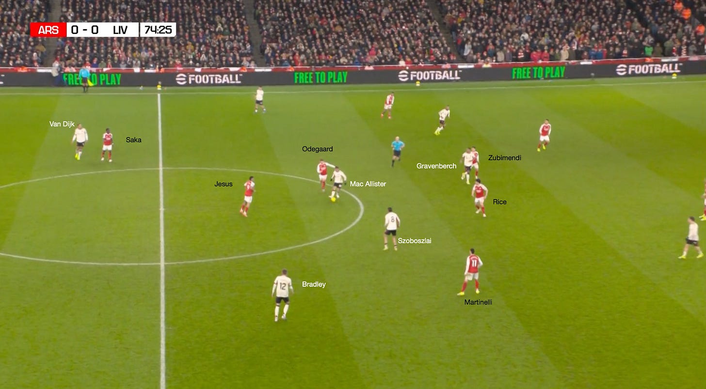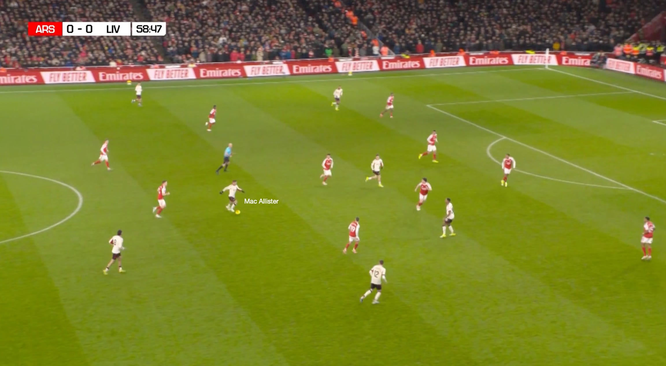 Here’s a final example shown below where the same pattern emerges. Neither Gabriel Jesus nor Ødegaard deny the entry pass into Mac Allister, and Rice can’t jump because of Szoboszlai. However, the general hesitancy displayed by our players, as Rice shows here, allowed Liverpool players, like Szoboszlai here, to get on the ball anyway. Notice Wirtz again in the left half space, with big Gabriel unsure to follow because of the run Frimpong could make in behind.
