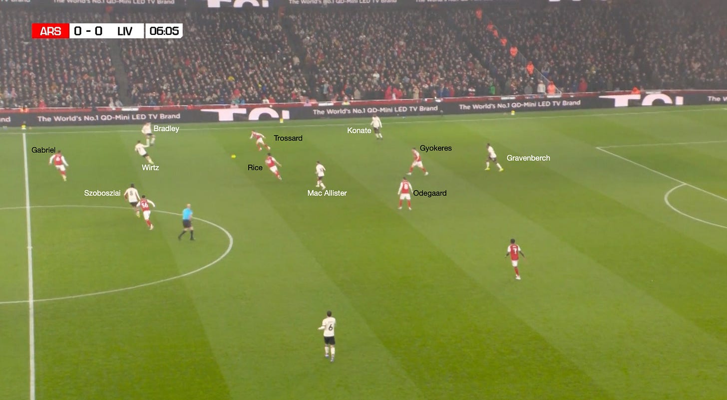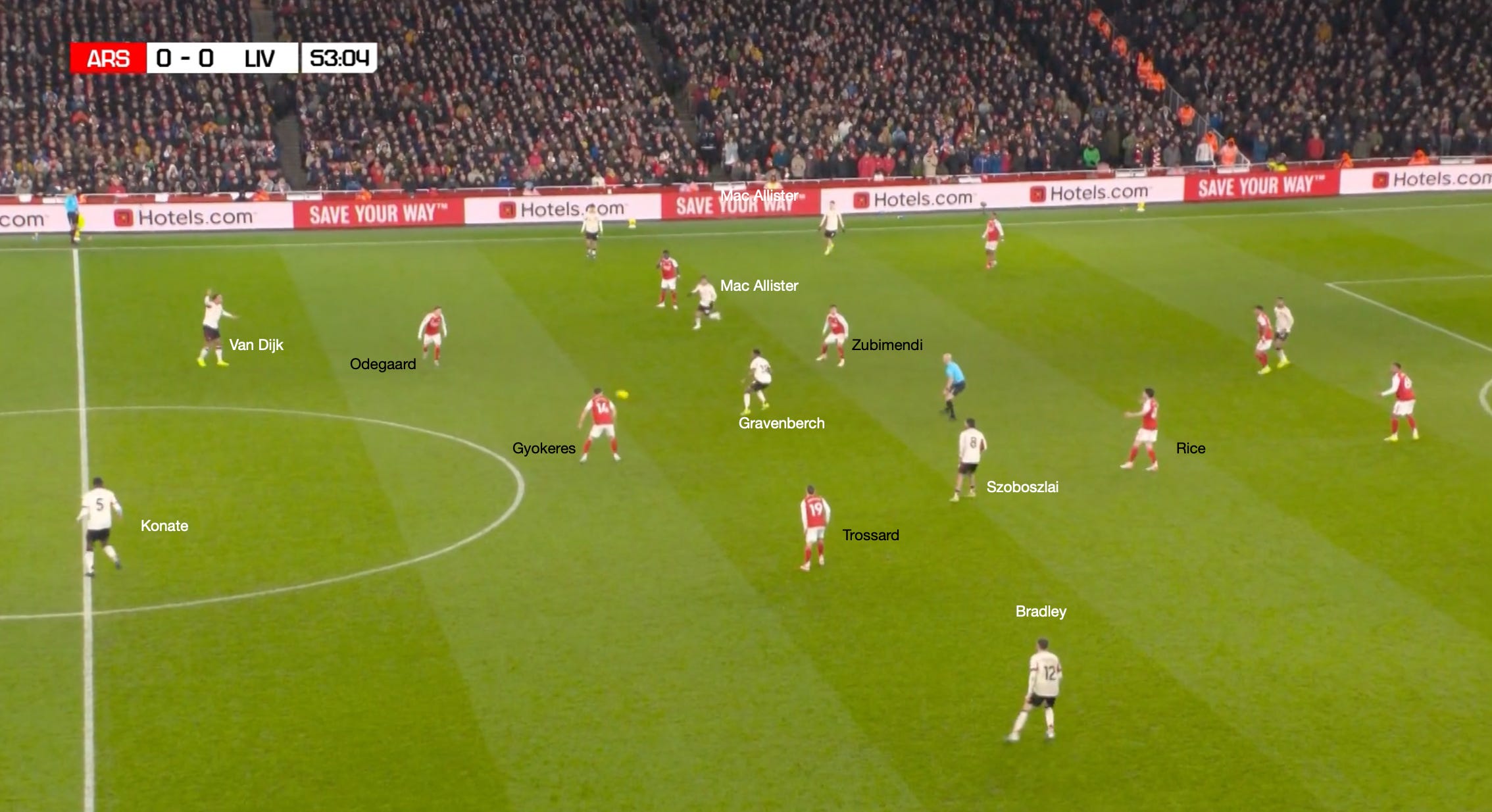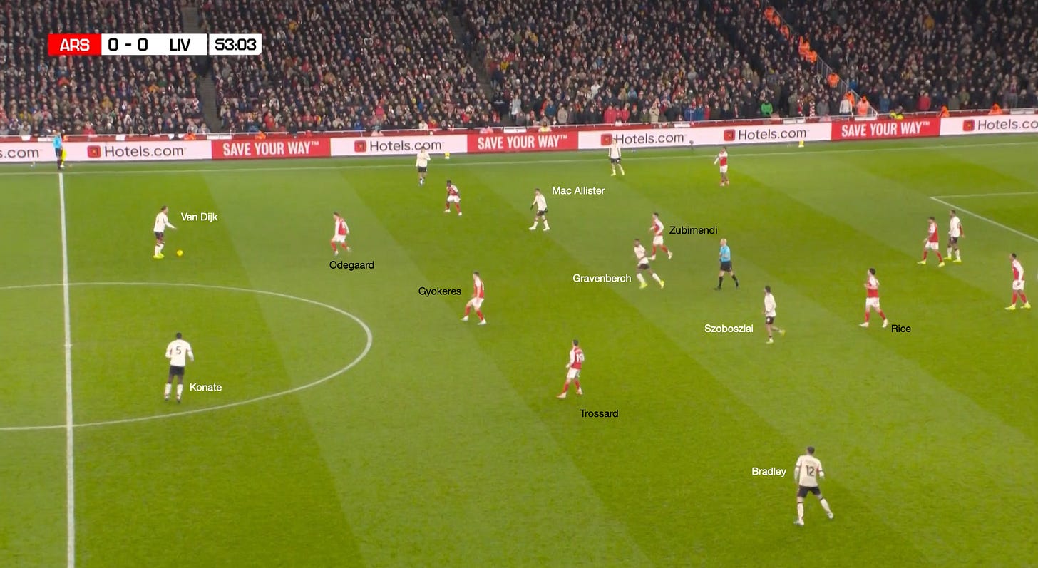 The line of pass from either Van Dijk or Konate to the first midfield receiver wasn’t frequently cut off. Neither Gyökeres nor Martin Ødegaard were consistent in this aspect, especially the former. When one jumps, the other marks the midfield receiver in a pendulum-like manner. Failure to do this means that teams dropping their midfielders deeper to overload central areas can gain joy. You can see from above that as Ødegaard gets closer to Van Dijk, Gyökeres must stop the entry pass into Gravenberch. He doesnt, which means that Gravenberch can get onto the ball, turn and face play. If Rice or Zubimendi jump, they then leave their designated markers free in the half spaces (Szoboszlai and Mac Allister).