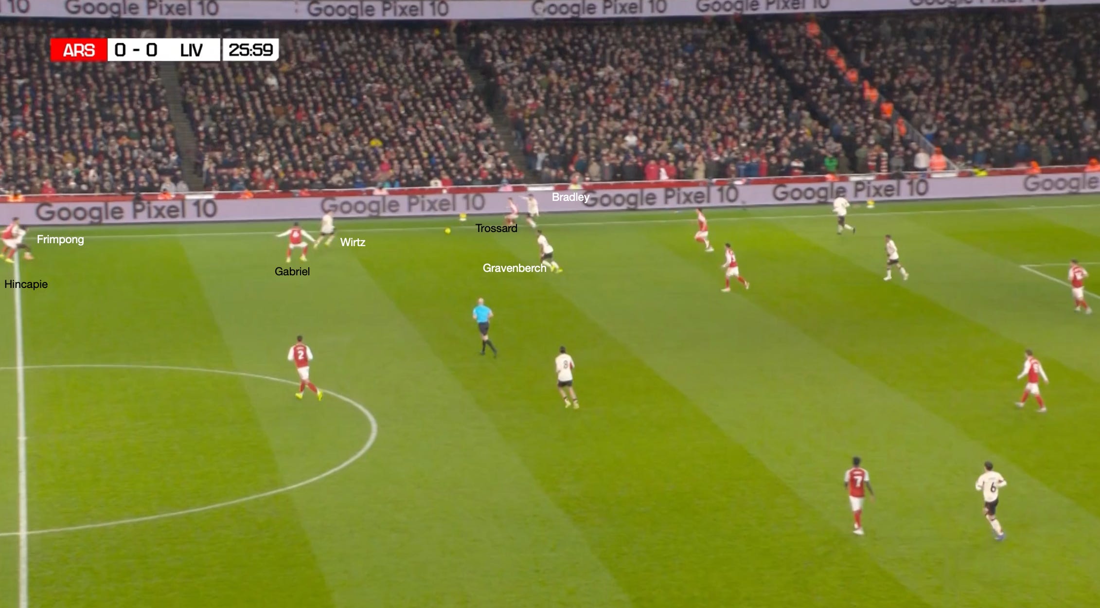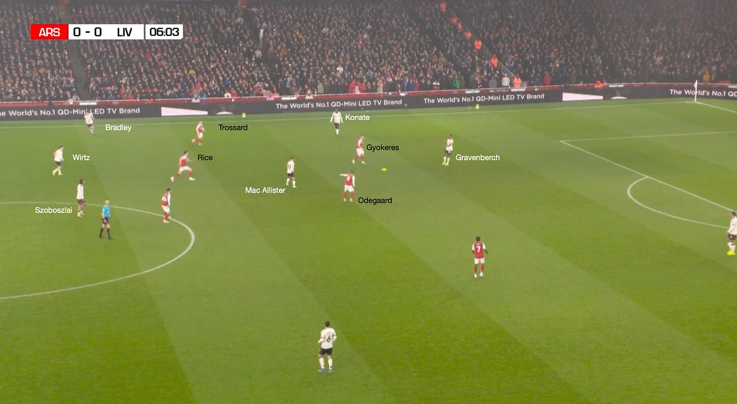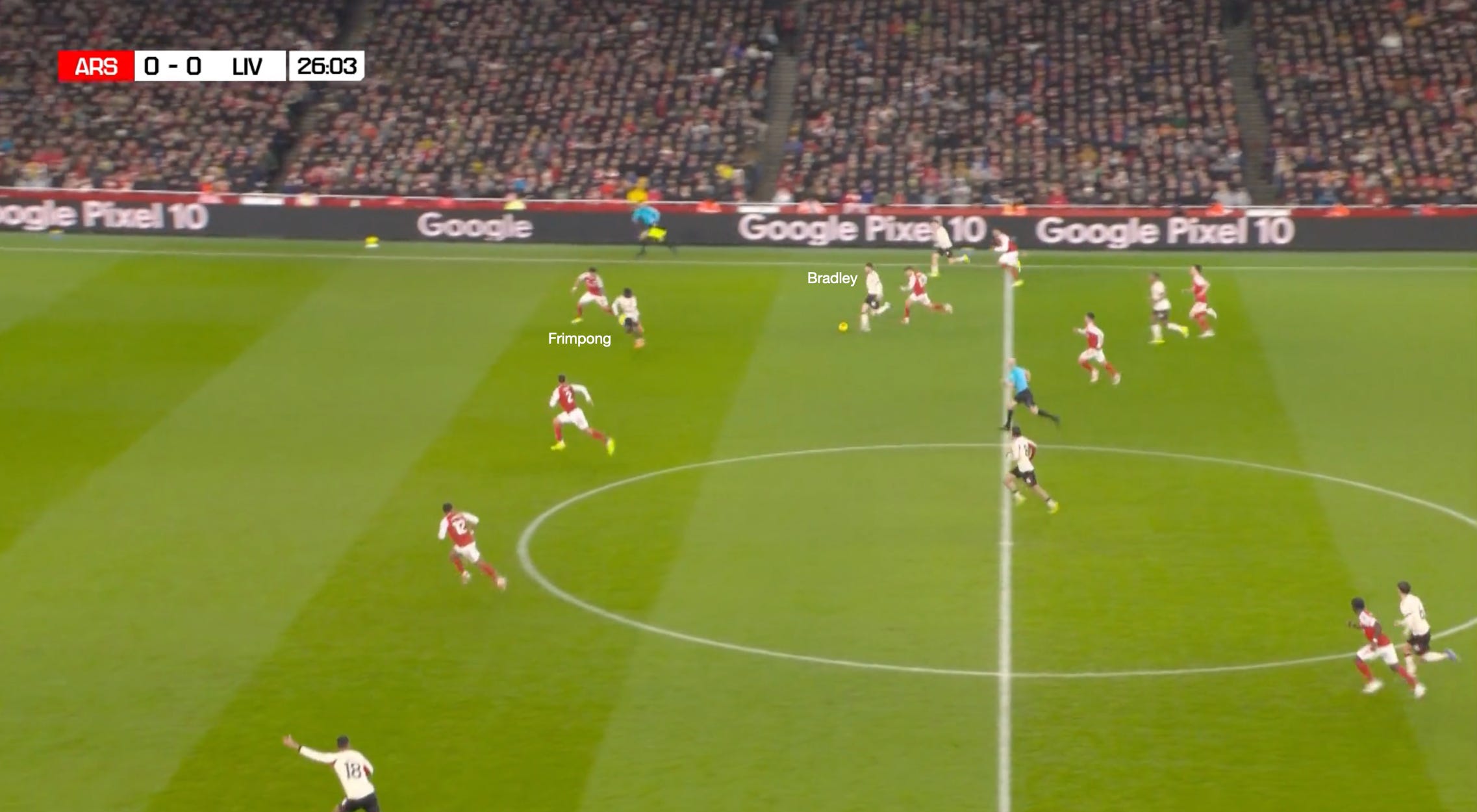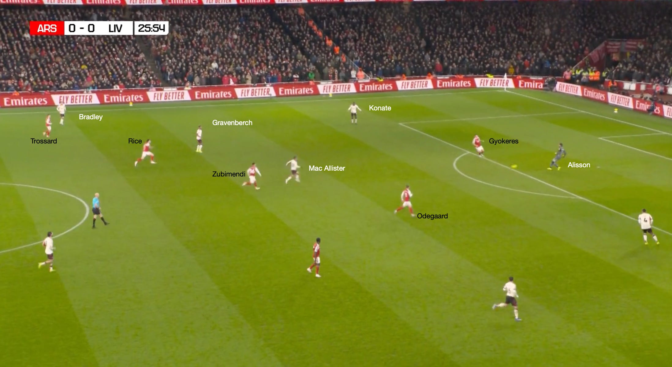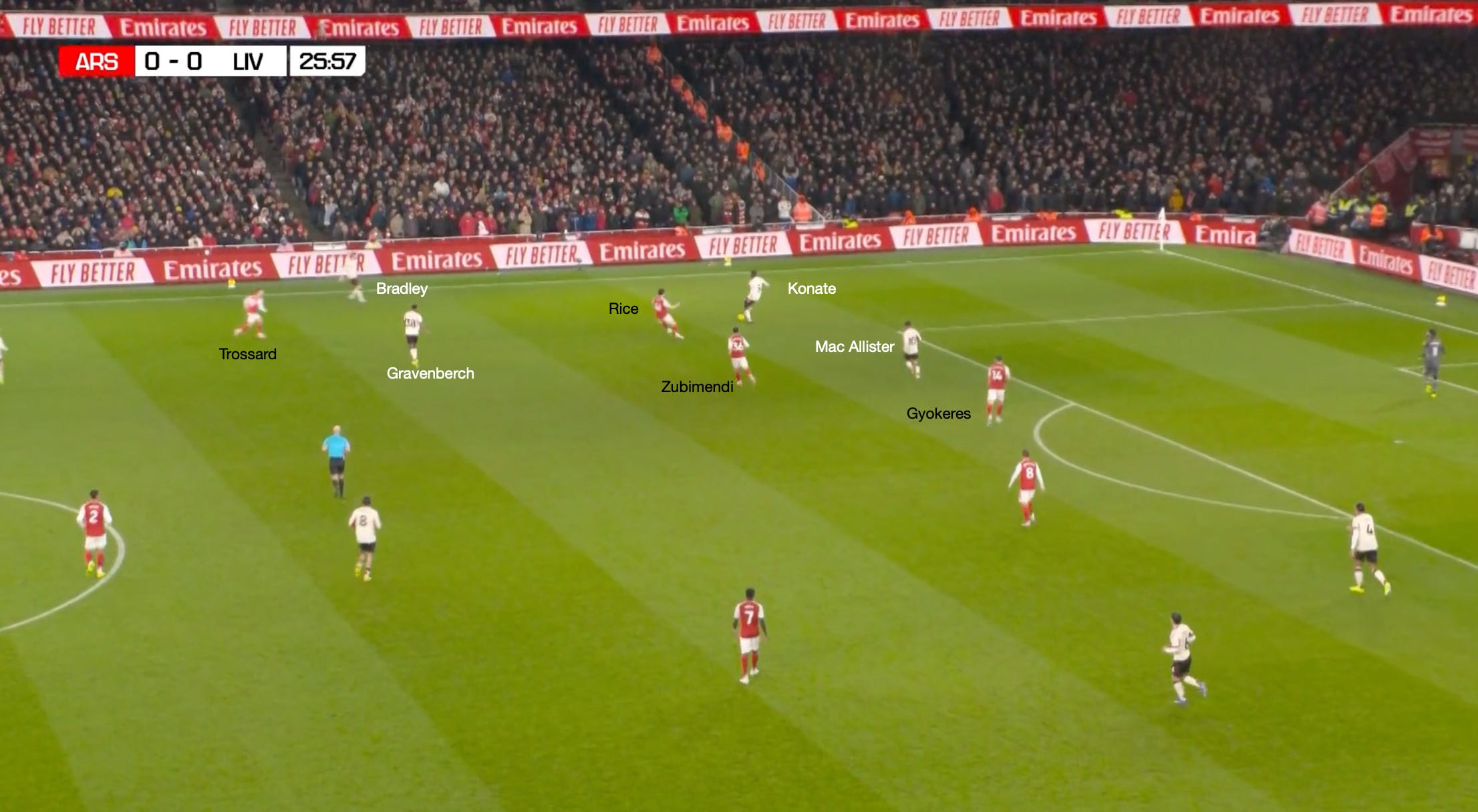 This time, it’s Rice, more out of frustration, who jumps to Konaté, which is the wrong move, as the overload centrally can now be fully exploited by Liverpool, since Gravenberch becomes the free man. Why? Because Trossard is on Bradley, big Gabriel on false 9, Wirtz dropping in, and Hincapié is marking Frimpong. Liverpool work it well around our pressure with their additional man, before Bradley is in a promising scenario to play Frimpong in and eventually Liverpool’s full back has the chance to open the scoring.
