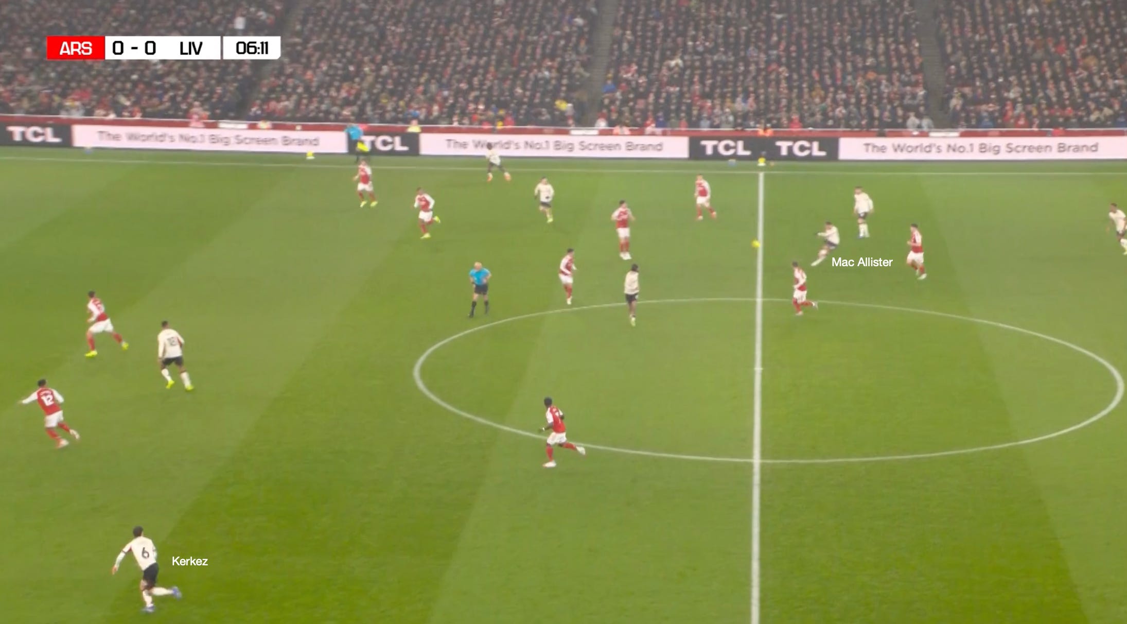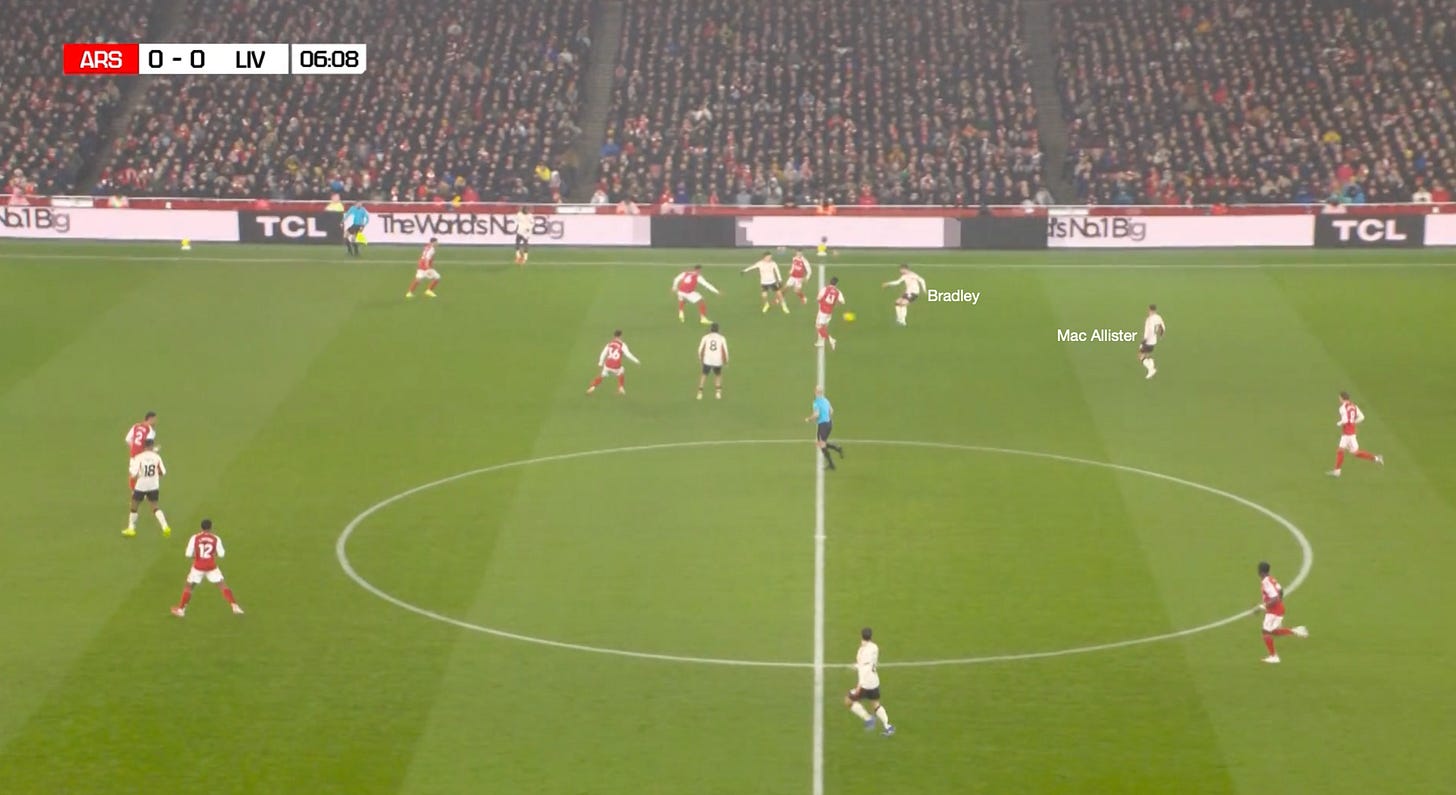 In layman’s terms, Liverpool have the spare man, and they exploit it here, following Rice eventually jumping to Mac Allister, with the latter finding Bradley, and now they are out. Soon after some tidy short combinations between Liverpool players on this side, Mac Allister receives the ball and delivers a huge switch of play to Milos Kerkez on the far side.